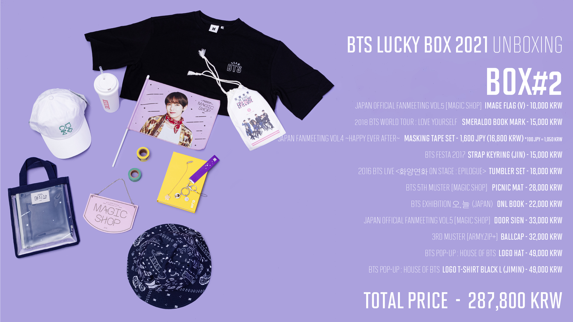 Wtslfb BTS LUCKY BOX 2021 Sold as SET ONLY Onhand and Ready to ship shopee checkout SET 1 - P2000 V ONL POSTER V MAGIC SHOP IMAGE FLAG MINI ACRYLI Chat to Buy. Each box comes with random items from various past concerts and events. LIKE FOLLOW cokodive 2.